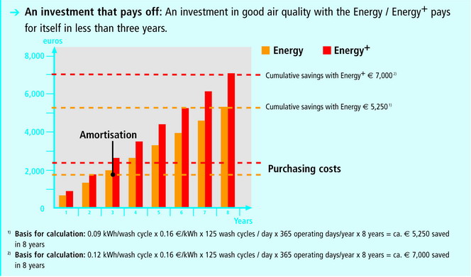 The GS 502 Energy+ / GS 515 Energy+ are additionally equipped with a waste water heat exchanger and use the energy from their waste water. This increases the savings to 70000 euros over eight years